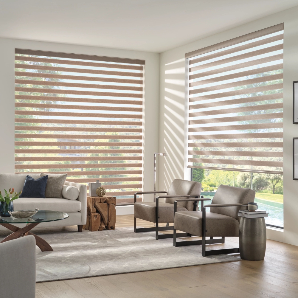 Create varying dimensions of light with the layered sheer and solid fabric bands of Designer Banded Shades.
